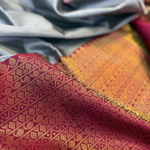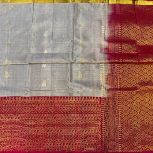 The body of the saree features a soft silver-grey tone accented with delicate gold woven motifs, creating a graceful and refined look. The highlight of this masterpiece is its rich red border and pallu, intricately woven with traditional gold zari patterns that showcase classic South Indian artistry.