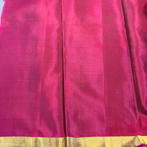 The grand gold zari work along the border adds depth, richness, and a regal touch, making it ideal for weddings, festive gatherings, temple visits, and special family occasions. The luxurious silk fabric ensures a smooth drape and comfortable wear while maintaining its structured elegance.